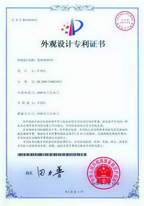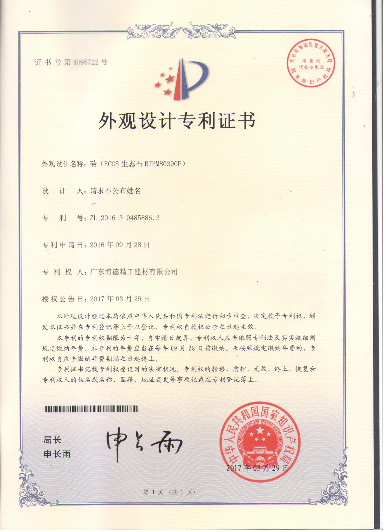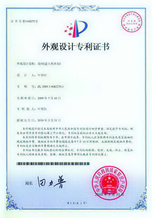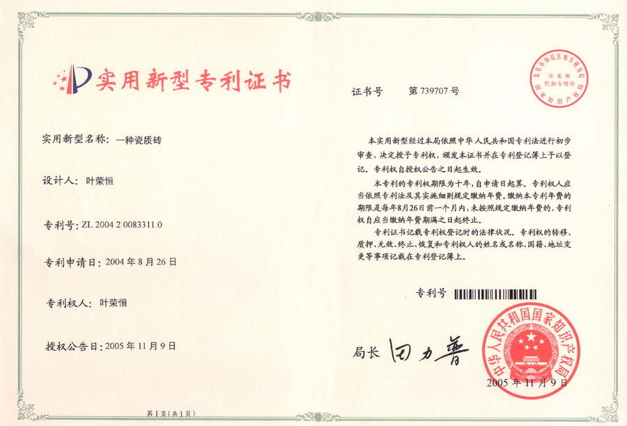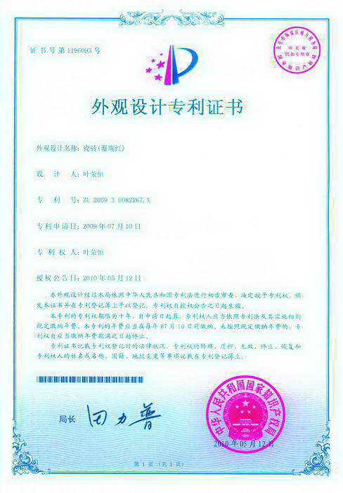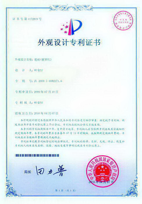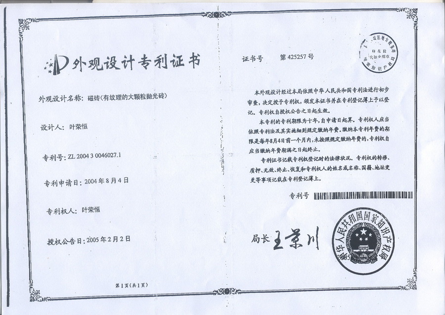 外觀專利證書(有紋理大顆粒拋光磚)