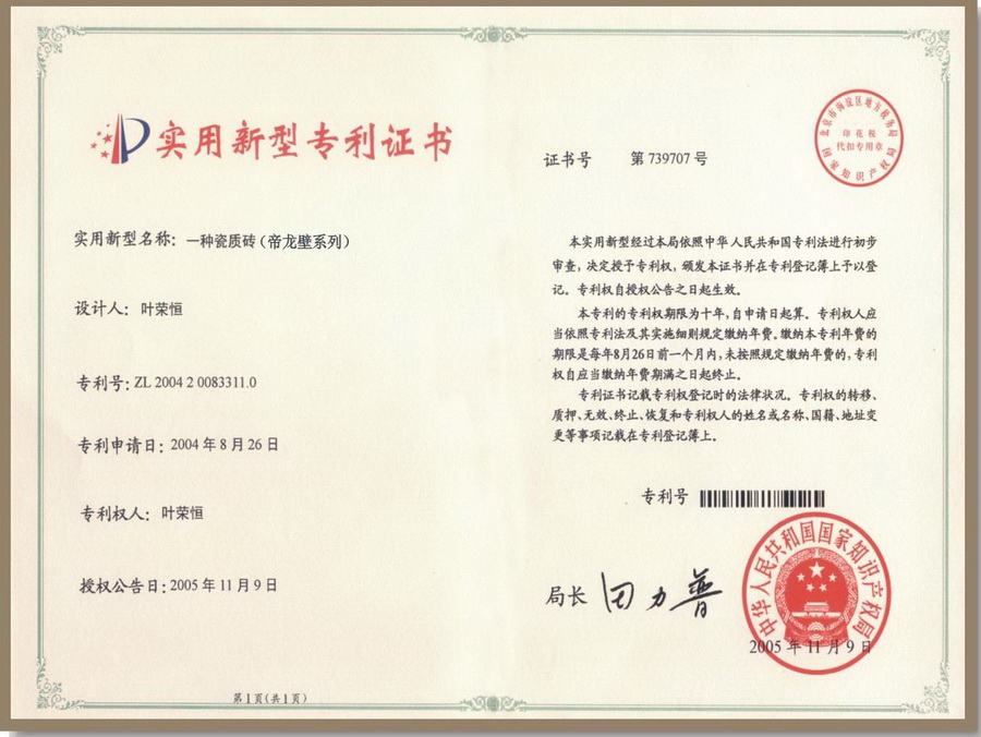 帝龍壁專利證書