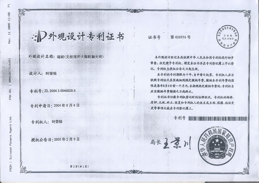 外觀專利證書(無紋理大顆粒拋光磚)