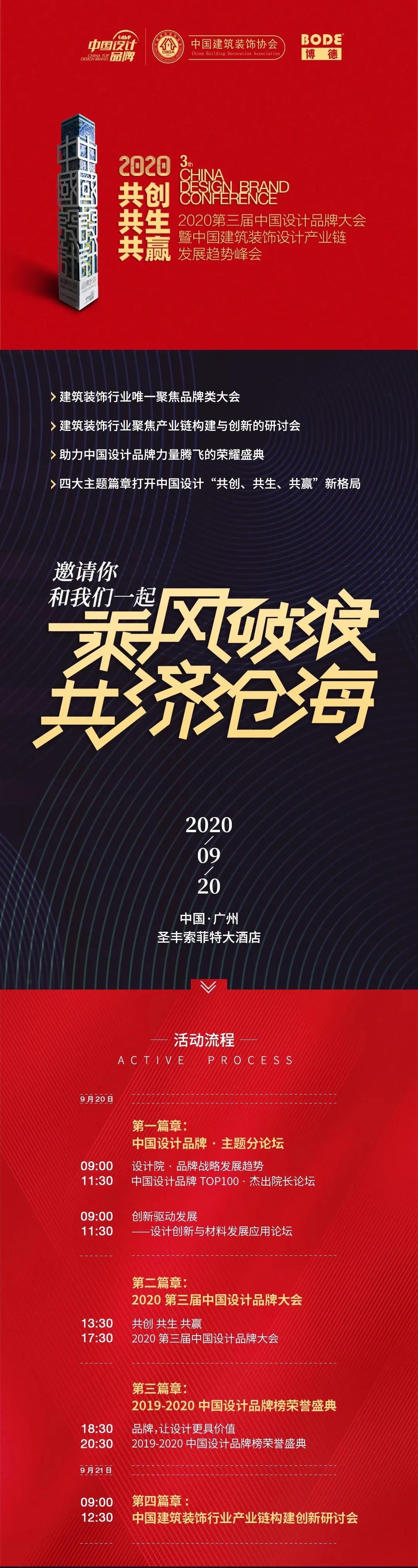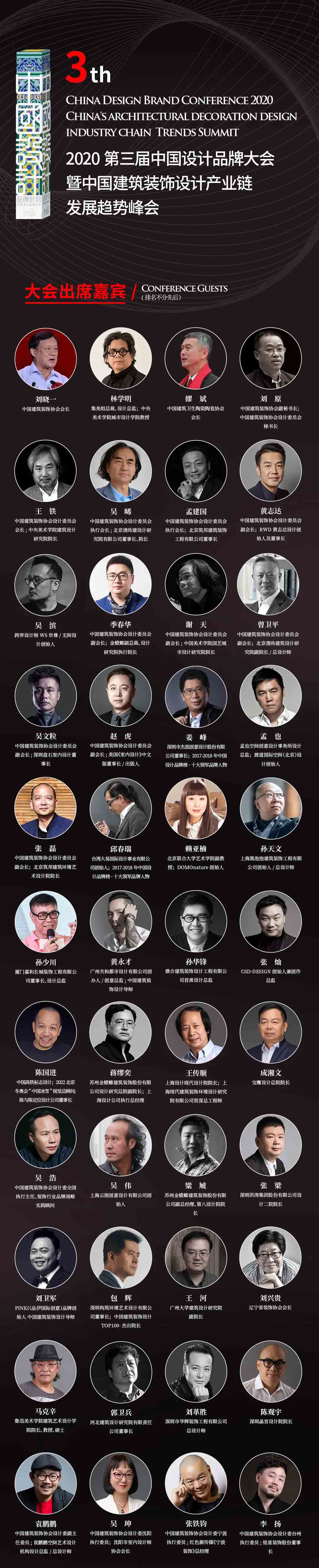 “共創 共生 共贏”2020第三屆中國設計品牌大會暨中國建築裝飾設計產業鏈發展趨勢峰會將於2020年9月20日在廣州盛大開幕。屆時大會將邀請來自行業協會領導、設計界名校、名師、名人、設計院意見領袖、地產界意見領袖、生產型企業意見領袖以及媒體代表,及來自北京、台灣、深圳、香港、廣州、上海、武漢、西安、杭州等城市的設計師精英共聚廣州·聖豐索菲特大酒店。