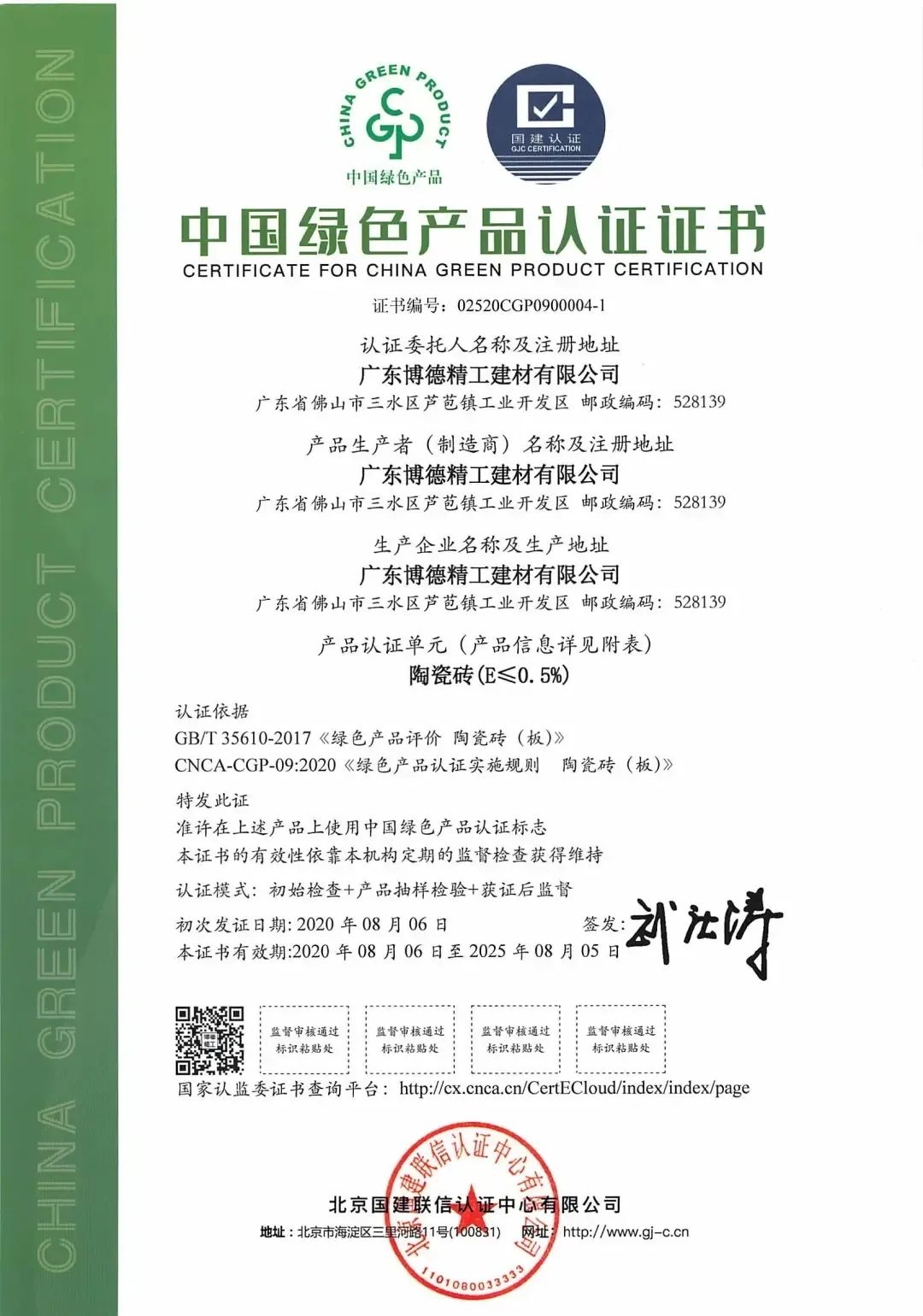 在此次認證中,廣東樱桃AV黄片精工建材有限公司及其陶瓷磚(E≤0.5%)樱桃APP污片通過嚴格的測評和考察,完全符合樱桃APP污片綠色與質量相融合,因此獲得“綠色”認證。